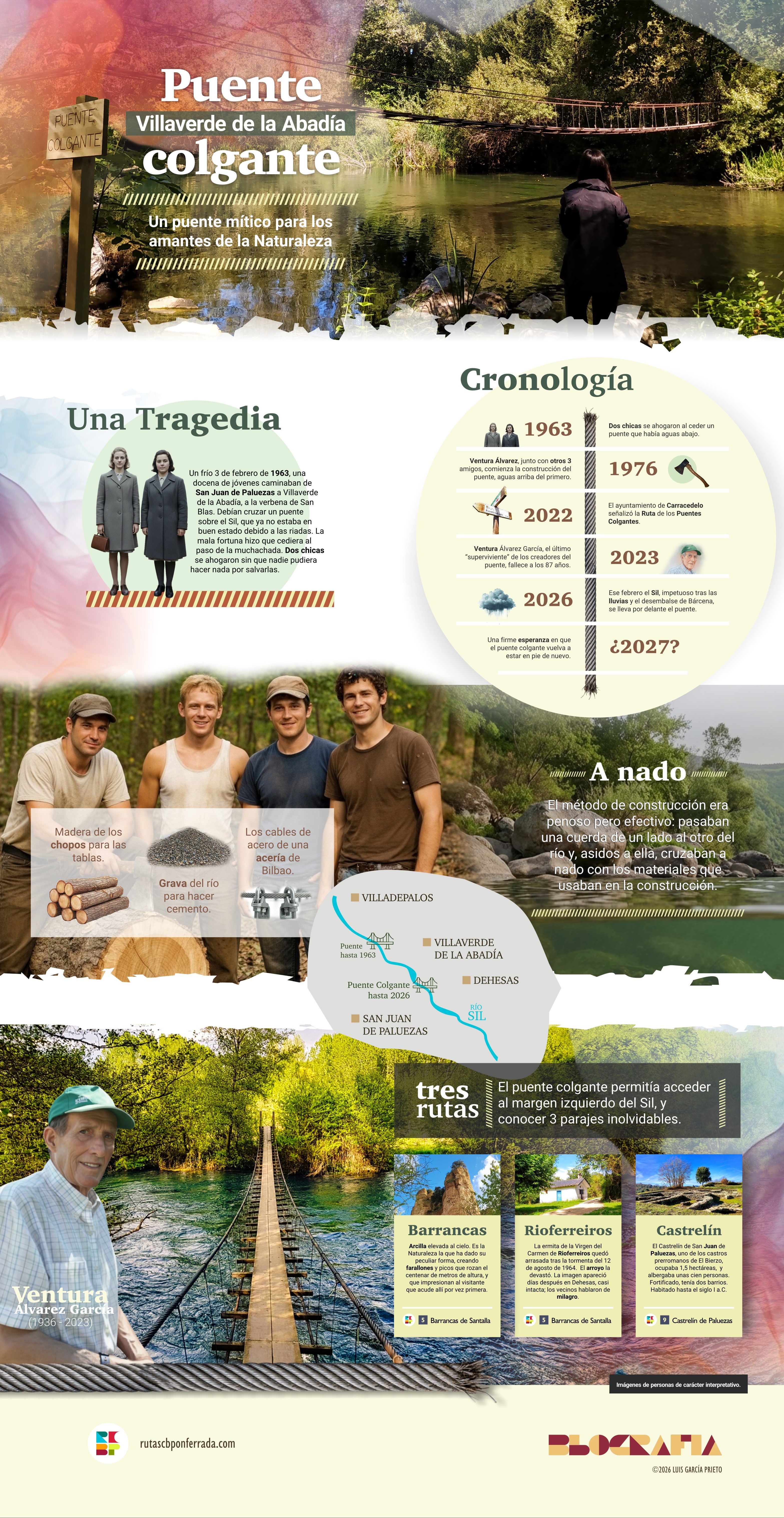 Un frío 3 de febrero de 1963, una docena de jóvenes caminaban de San Juan de Paluezas a Villaverde de la Abadía, a la verbena de San Blas. No es difícil imaginar la alegría y el paso confiado. A buen seguro, a alguno de aquellos chicos y chicas debió de hacérsele un nudo en el estómago cruzar aquel puente sobre unas aguas con el ímpetu del invierno. La recompensa bien valía el tránsito. Ese puente ya no estaba en buen estado debido a las riadas. Pero no había otra manera más sencilla de salvar el Sil. La fortuna, la mala, hizo que cediera al paso de la muchachada. Dos chicas se ahogaron sin que nadie pudiera hacer por salvarlas. Aquel día San Blas se alió con el padre Sil para recordarnos que somos mortales.